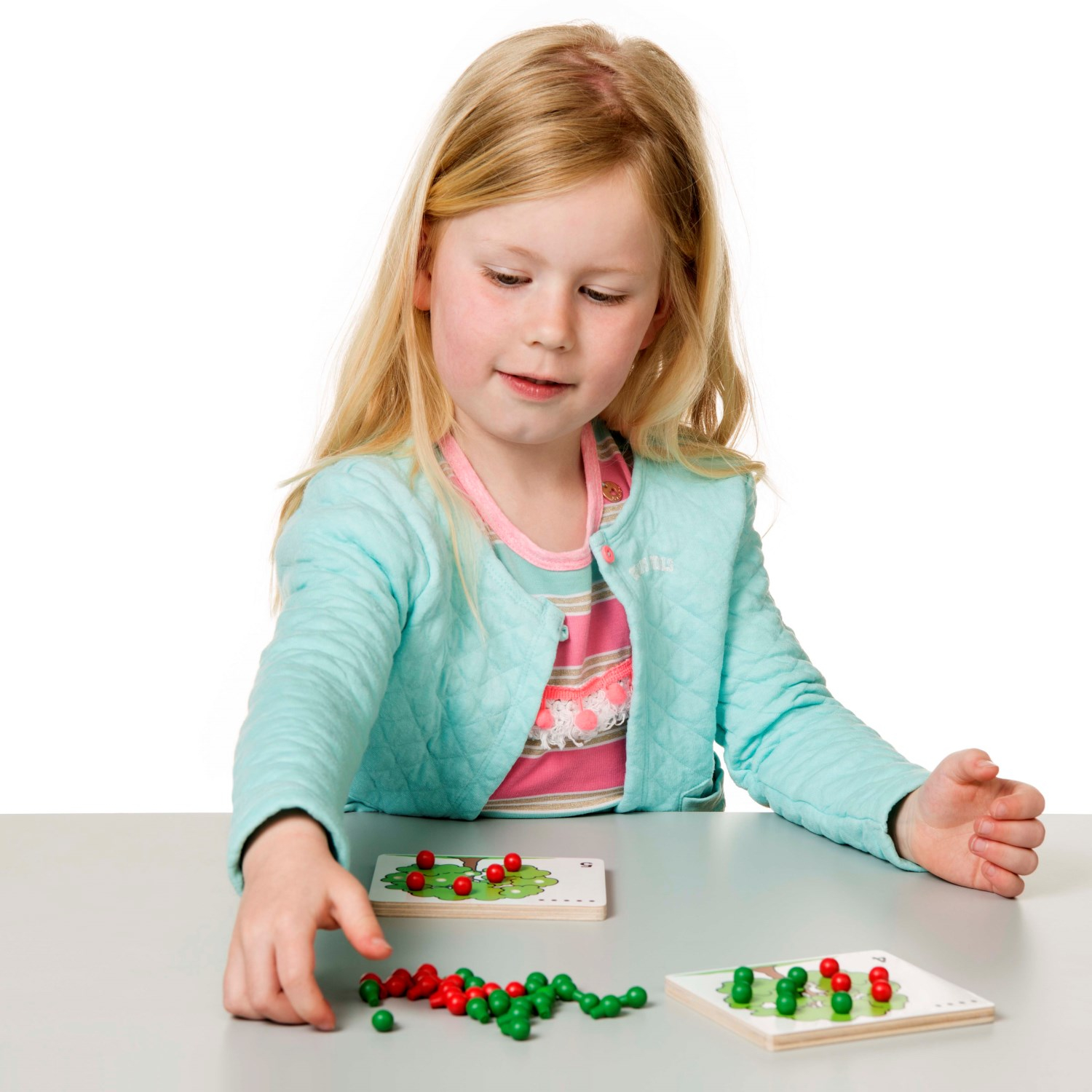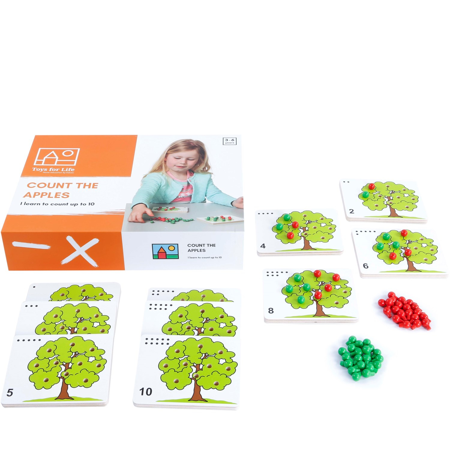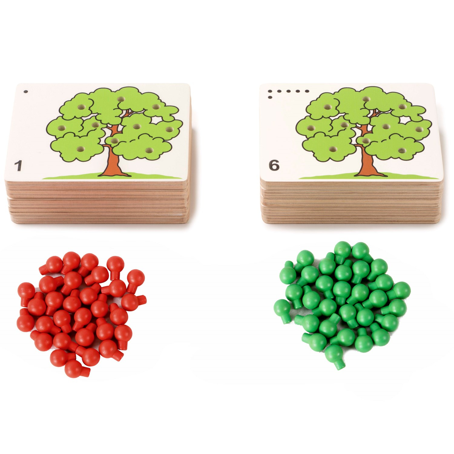 Umple copacii cu numărul de mere roșii indicat de un simbol numeric și puncte. Completează copacii cu mere verzi până la 10. Dezvoltă abilitățile motorii fine.