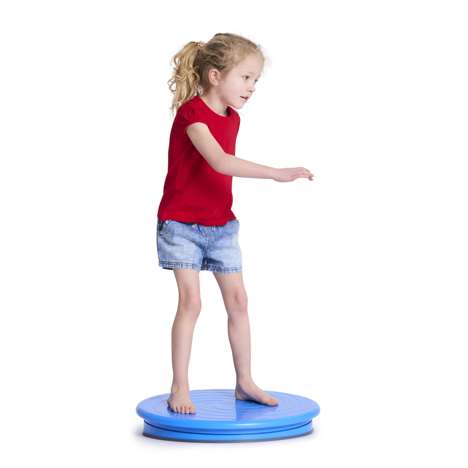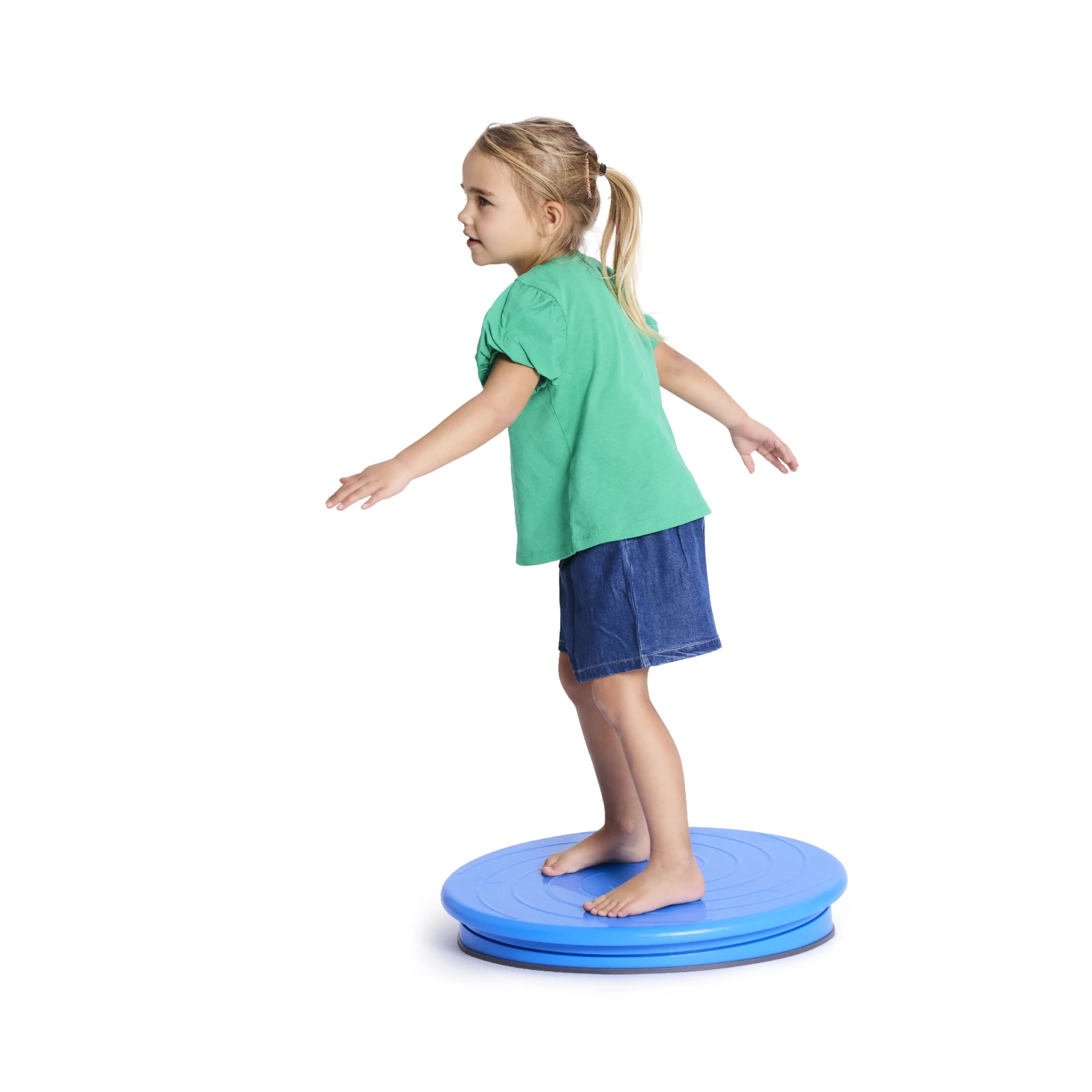 Discul rotativ de podea are o suprafață ușor înclinată, permițând copilului să crească viteza de rotație prin ajustarea centrului de greutate prin mișcarea corpului. Este proiectat cu o bază stabilă, completată cu o margine din cauciuc antiderapantă și montată pe cinci rulmenți cu bile, asigurând o rotire lină și eficientă.