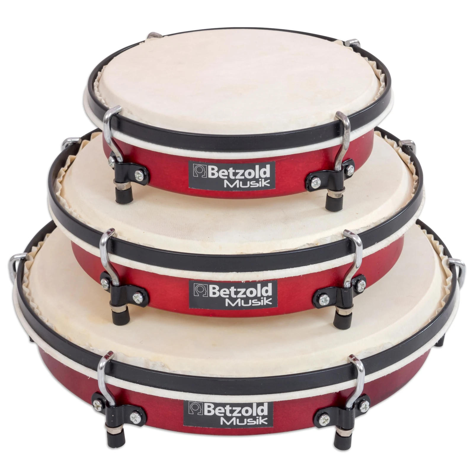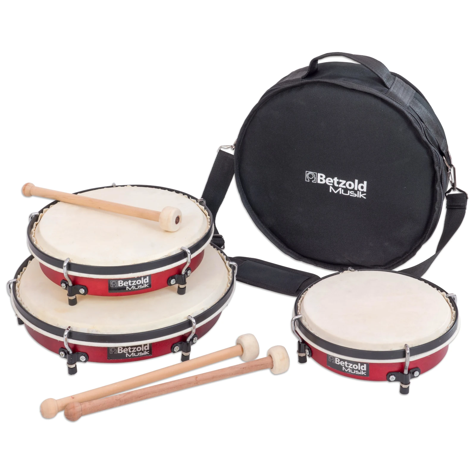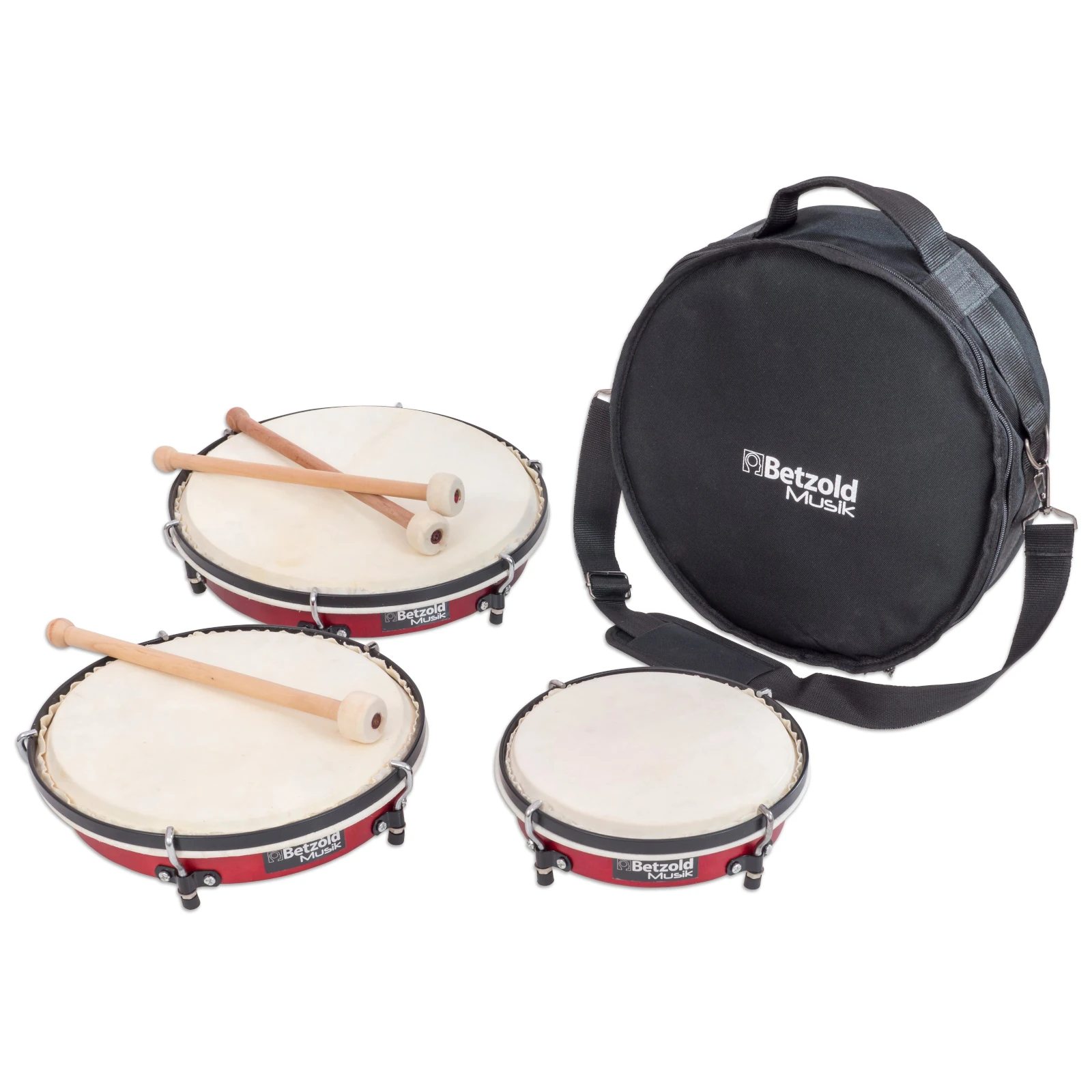 Un set format din 3 tobe cu piele naturală și 3 bețe cu cap moale. Tobele sunt acordabile cu inele de tensionare. În geanta de depozitare și transport sunt incluse și perne pentru protecție împotriva deteriorării.