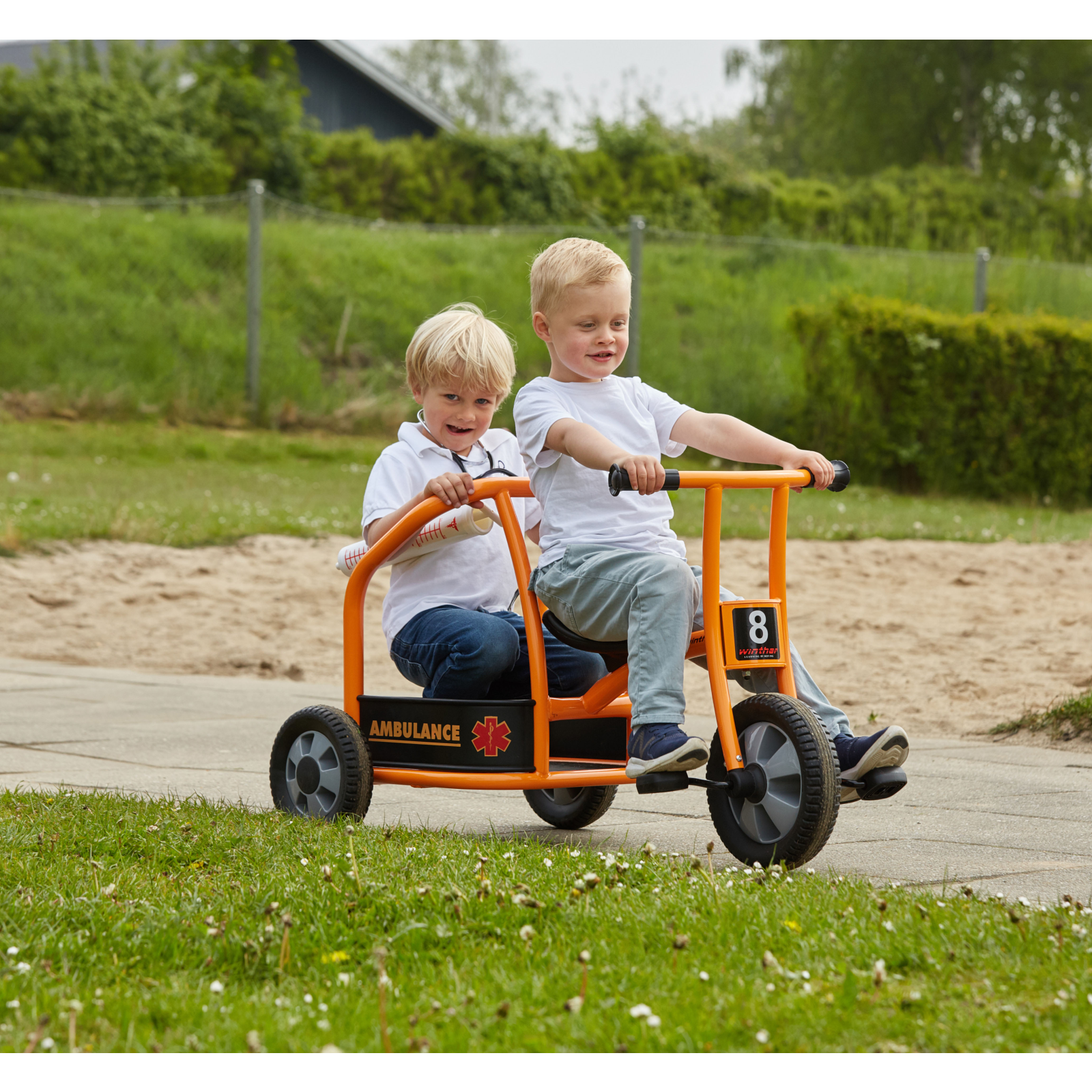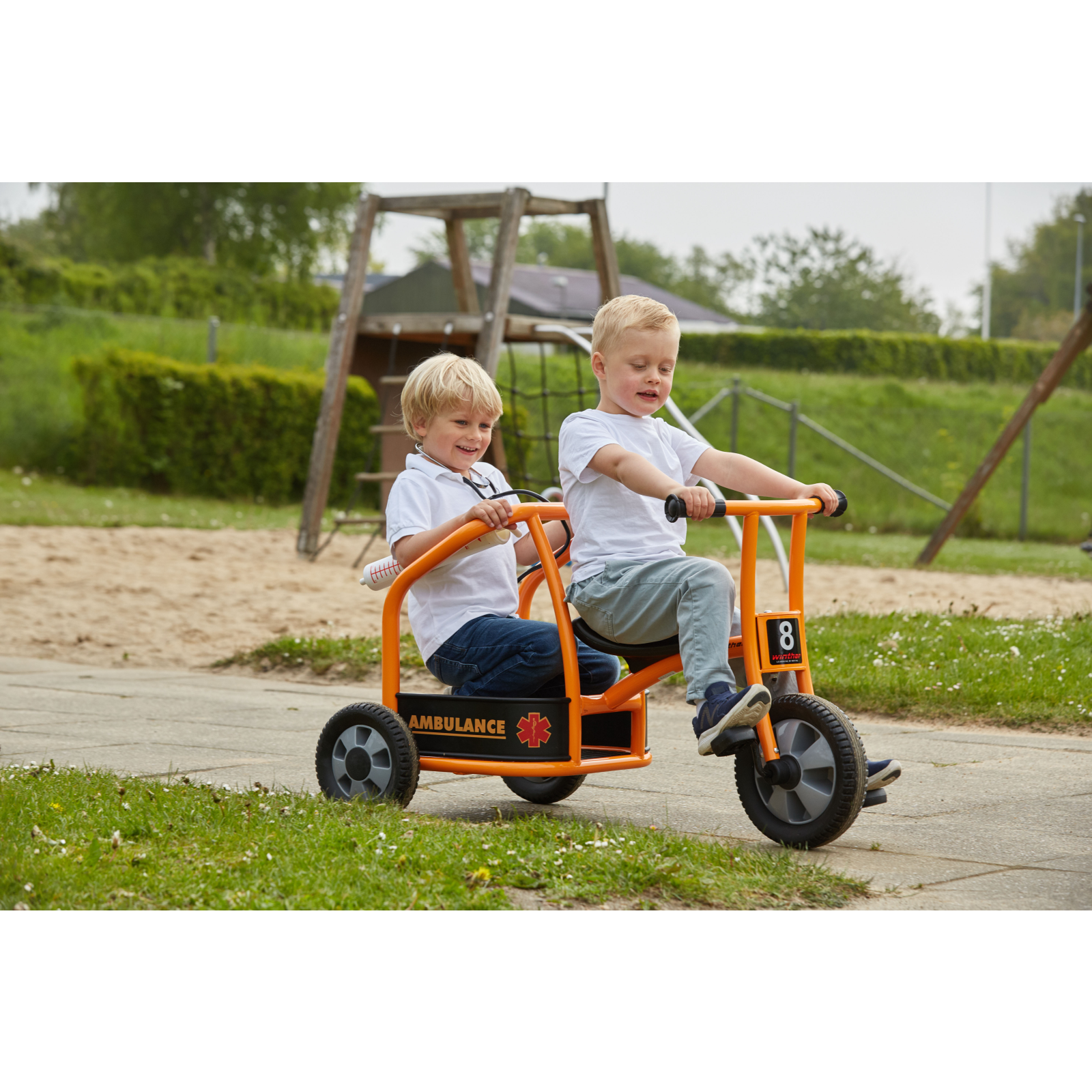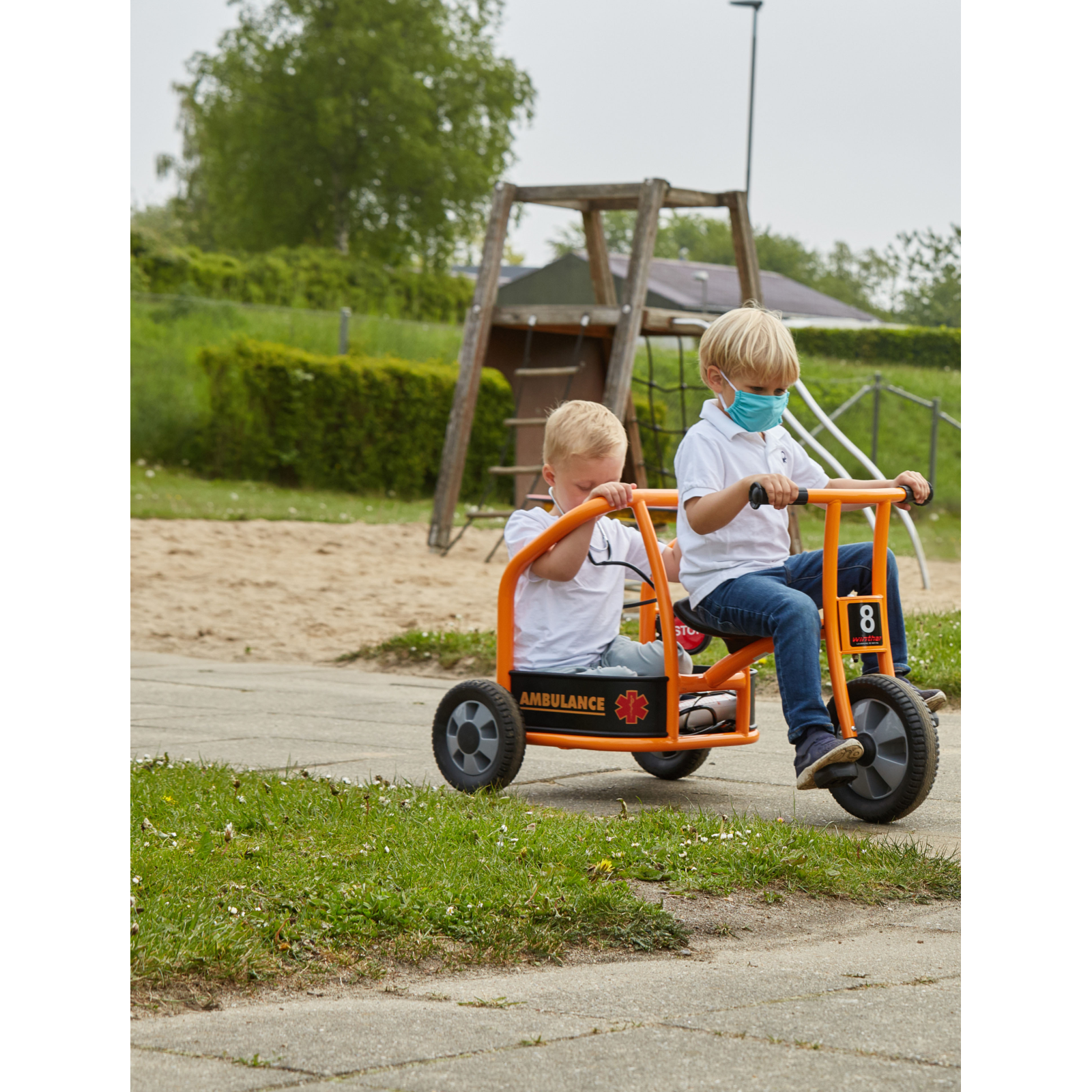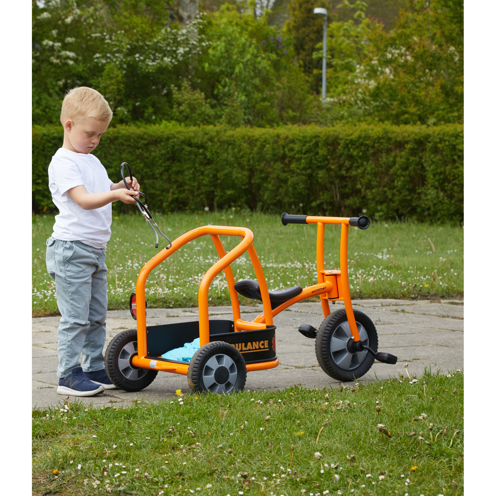 Chemați ambulanța! În parc se află un băiețel care se preface că este bolnav – are dureri mari de burtă. Din fericire, doi medici ajung imediat la fața locului cu această ambulanță triciclu. Este rapidă, distractivă și ajută la dezvoltarea abilităților sociale și motorii.