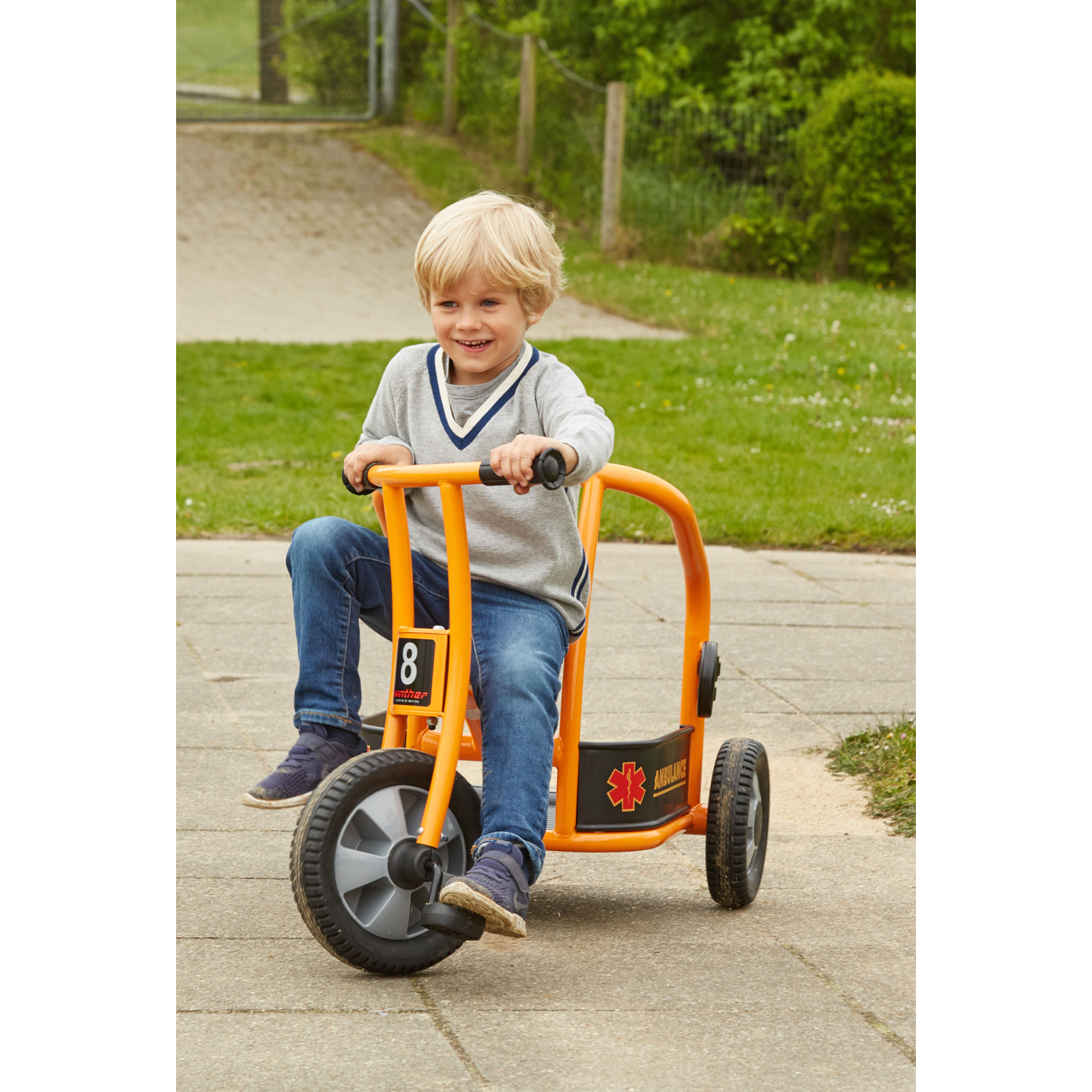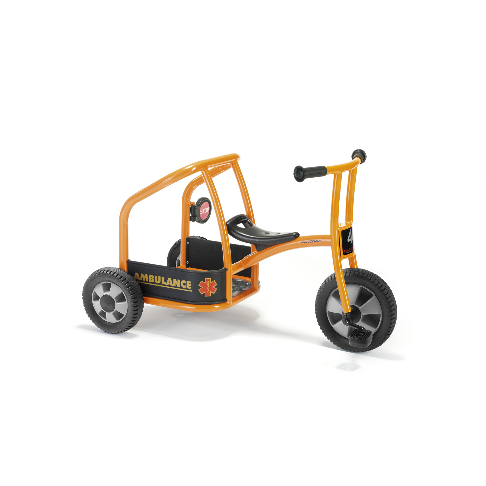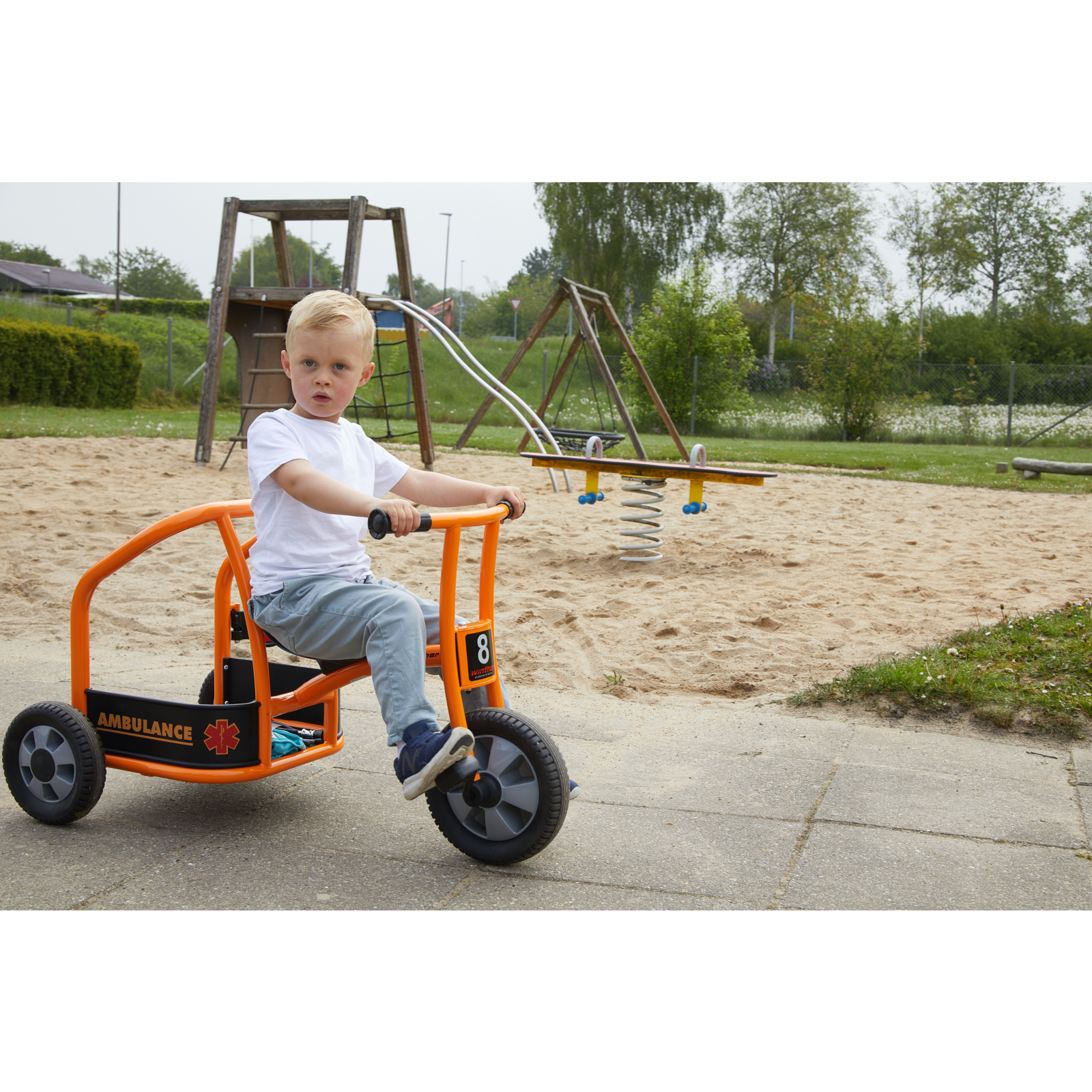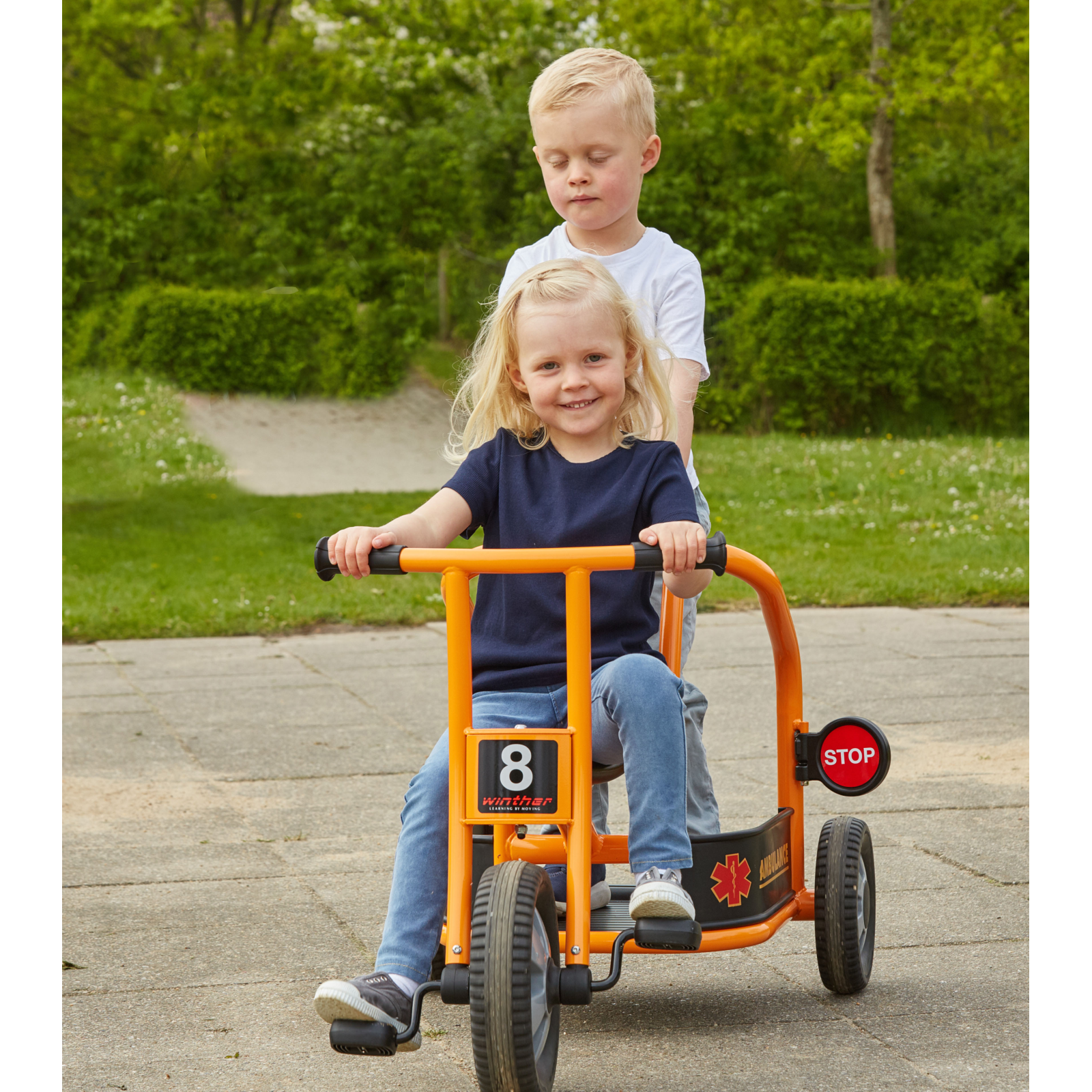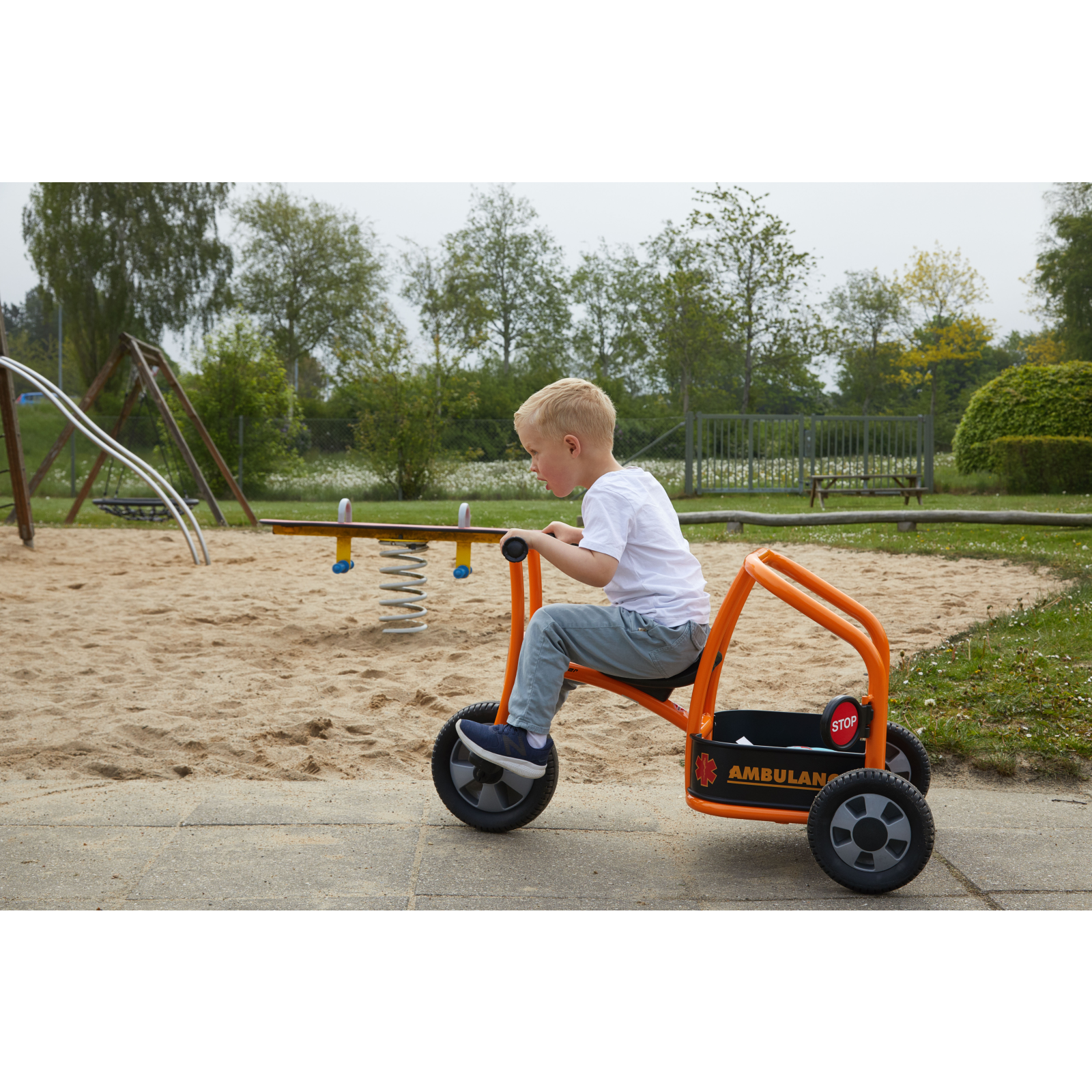 Chemați ambulanța! În parc se află un băiețel care se preface că este bolnav – are dureri mari de burtă. Din fericire, doi medici ajung imediat la fața locului cu această ambulanță triciclu. Este rapidă, distractivă și ajută la dezvoltarea abilităților sociale și motorii.